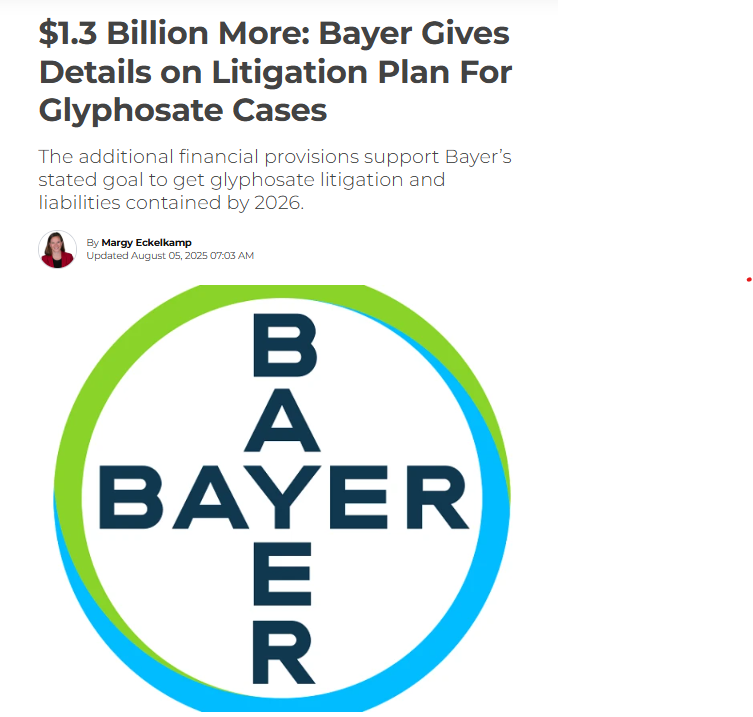 To-date Bayer has paid more than $10 billion to plaintiffs in litigation claiming Roundup as the cause of their cancer. The additional financial provisions support Bayer’s stated goal to get glyphosate litigation and liabilities contained by 2026. The latest announcement from Bayer states the timeframe as “by the end of 2026” whereas previous reports have more been ambiguous about the 2026 deadline.