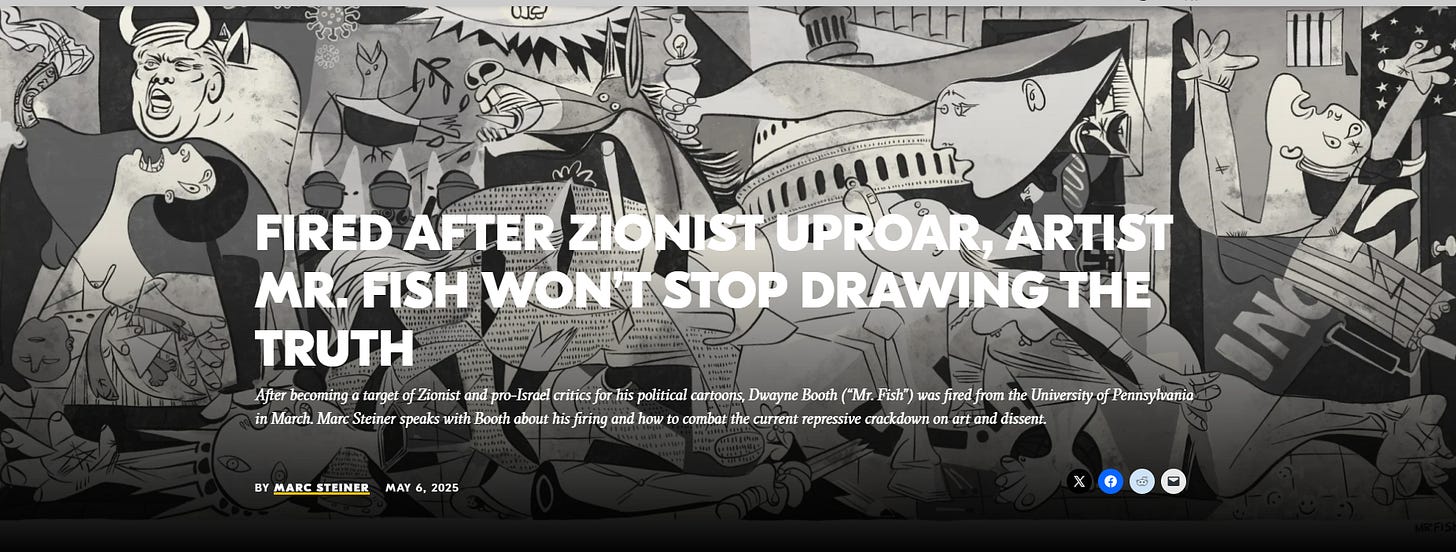 World-renowned political cartoonist Dwayne Booth, more commonly known as Mr. Fish, has found himself in the crosshairs of the new McCarthyist assault on free expression and higher education. While employed as a lecturer at the University of Pennsylvania, Booth became a target of Zionist and pro-Israel critics, and his work became a flashpoint of controversy in the months leading up to his firing in March. Facing charges that certain cartoons contained anti-Semitic tropes, J. Larry Jameson, interim president of the University of Pennsylvania, denounced Booth’s illustrations as “reprehensible.”