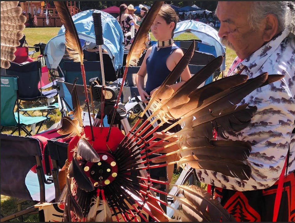 Flow, white man with old man with autism, flowing in the dance of Pow wow, the vendors throwing Benjamins. Elders and young, paraded along paved roads. Magnificent blankets with eagle, bear, cougar.