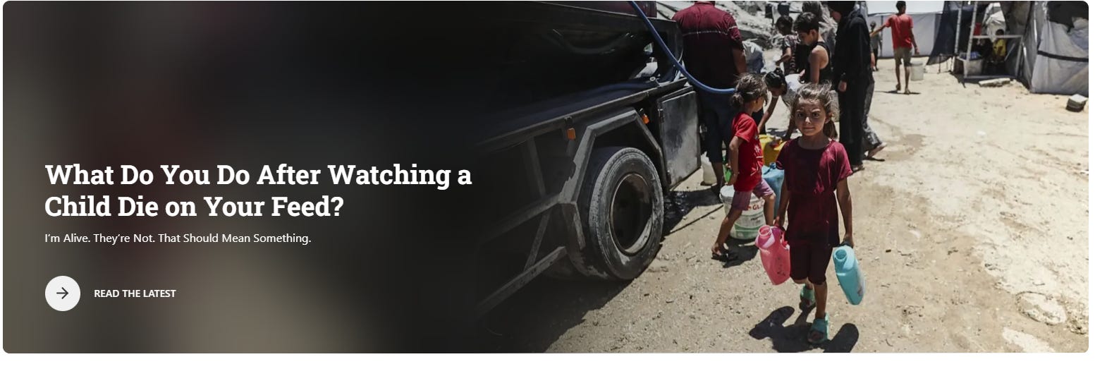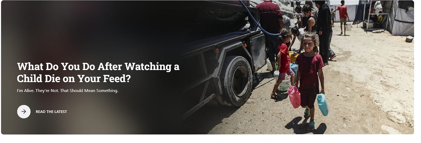 This morning I listened to “On Being,” the episode where Krista Tippett interviews a grief therapist who says our bodies are not built to carry the full weight of the world. She speaks softly, in the way people do when they are trying to soothe without sounding patronizing, and tells her audience that it is okay to look away. I’m standing in my kitchen with my thumb on the nespresso (one I bought before they joined the boycott list), nodding along, even though I know I will resent her words by noon. — Ahmad Ibsais