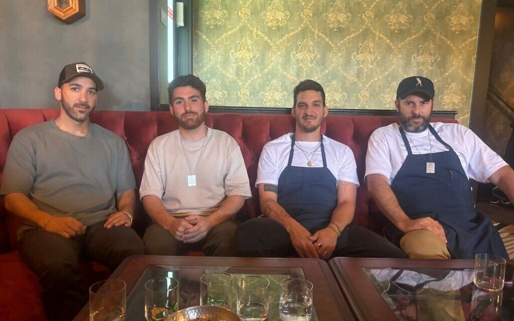 [From left to right: Carmel restaurant partners Liron Hazan, Ronnie Benarie, Asaf Moaz, Yoav Schverd, in their Los Angeles, California eatery, May 2024.]