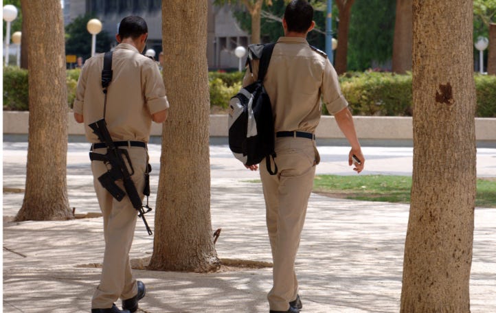 [Israeli soldiers at Ben-Gurion University, in Be’er Sheva, May 8, 2013.]