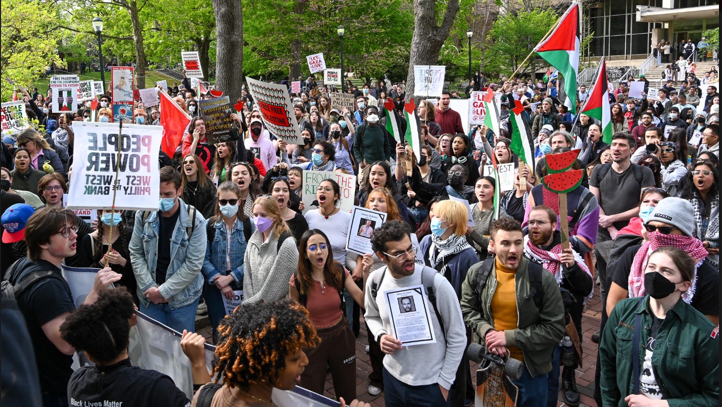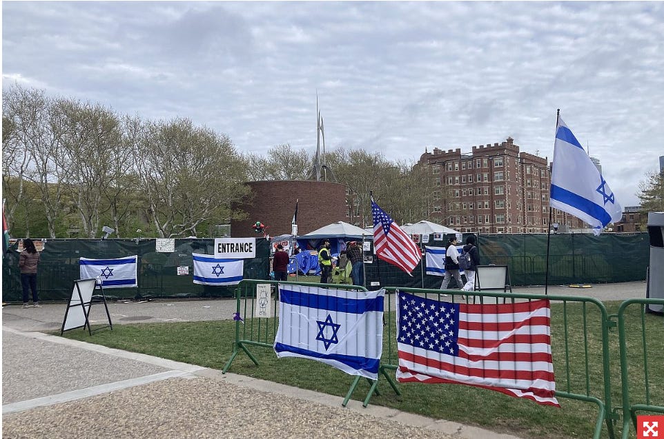 [Israeli and U.S. flags seen on MIT’s campus during the university protests, in Cambridge, Massachusetts, May 4, 2024.]