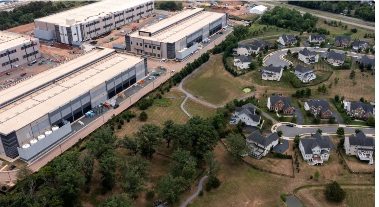 [An Amazon Web Services data center near single-family homes on July 17, 2024, in Stone Ridge, Virginia. The PJM Interconnection’s board on Aug. 11, 2025, launched a fast-track stakeholder process to develop rules for interconnecting data centers and other large loads to the grid]