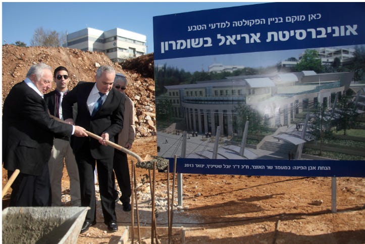 [Chancellor of the Ariel University Center of Samaria Yigal Cohen Orgad (L) and Israeli Finance Minister Yuval Steinitz seen at a cornerstone ceremony for the new Faculty of Science, January 15, 2013.]