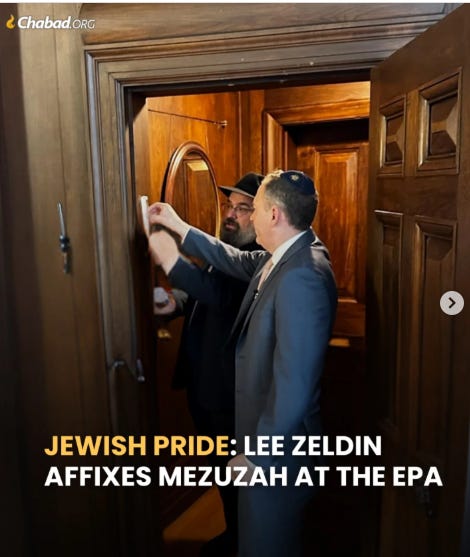 [Lee Zeldin, Administrator of the Environmental Protection Agency, affixed the mezuzah to his office door with Rabbi Levi Shemtov, Executive Vice President of American Friends of Lubavitch (Chabad) in Washington, DC.