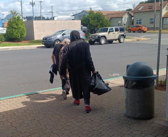 The tall guy with the red shoes, well, his bag ripped on the street. Imagine that, no Jesus Prayers that Walmart of Big 5 or some other scum bucket outfit would donate seconds or slighty-damaged backpacks for the houseless.