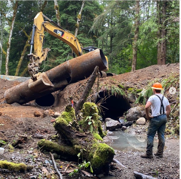 Evan: In the last couple years we have tackled some very big projects, though any large wood placed in a stream, any tree planted, or invasive species removed is a success. By far the most observable success was the North Creek culvert project. This project was completed in 2019, restoring full aquatic organism passage to 13 stream miles of pristine habitat on US Forest Service managed lands in the Drift Creek (Siletz) basin. The undersized culvert, installed in 1958, not only blocked adult and juvenile salmon from accessing habitat upstream, but also ceased river processes and degraded habitat above and below the culvert site. The complex project in a remote location was difficult, and 60 years of “Band-Aid” solutions failed because they didn’t address the real problem: the culvert itself.