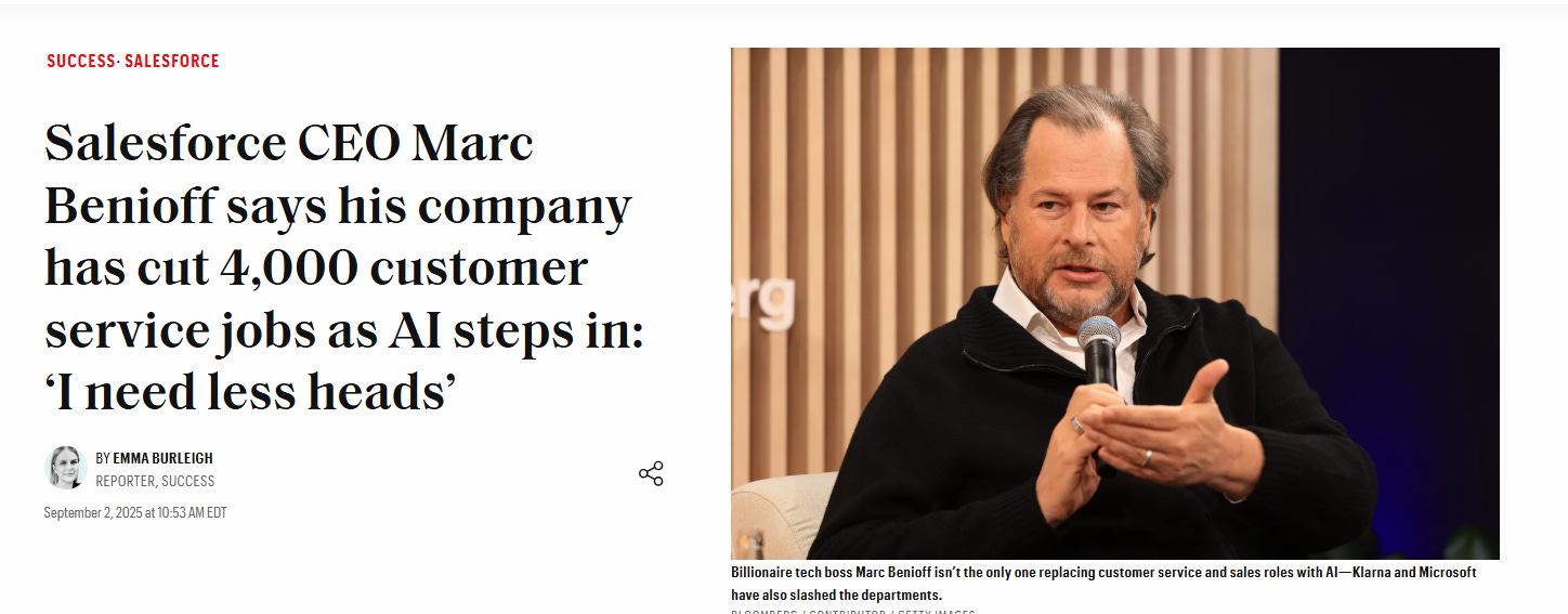 Jew Patrol: Billionaire CEO Marc Benioff said his $248 billion Salesforce has cut about 4,000 customer service roles as AI agents step in to do the work. Just like Klarna and Microsoft, the Silicon Valley mogul revealed he just “needs less heads” now that the technology can handle over a million consumer conversations and has reduced support costs by 17% since around the start of 2025. It’s a change of tune from Benioff’s previous comments that AI wouldn’t lead to a white-collar wipeout.