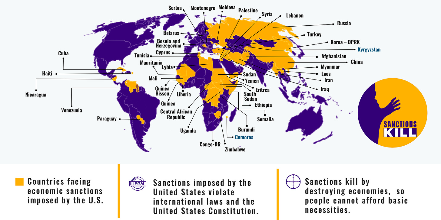 US sanctions affect a third of humanity with more than 8,000 measures impacting more than 40 countries. The countries imposing economic sanctions are the wealthiest, the most powerful, and the most industrially developed countries in the world. The intention is to choke the economies of developing countries, most of which were formerly colonized. Sanctions on one country impact the economies of the whole region. As of September 2022 it includes the following countries: