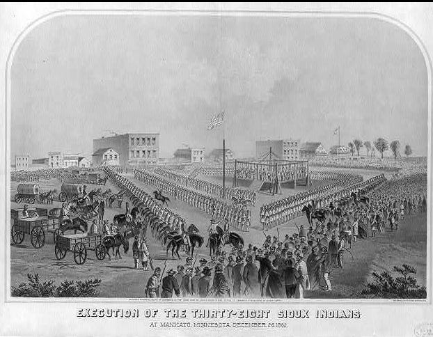 Minnesota was a new frontier state in 1862, where white settlers were pushing out the Dakota Indians—also called the Sioux. A series of broken peace treaties culminated in the failure of the United States that summer to deliver promised food and supplies to the Indians, partial payment for their giving up their lands to whites.