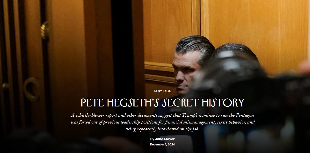 - “The report also says that Hegseth, who was married at the time, and other members of his management team sexually pursued the organization’s female staffers, whom they divided into two groups — the ‘party girls’ and the ‘not party girls,’” The New Yorker’s Jane Mayer wrote.