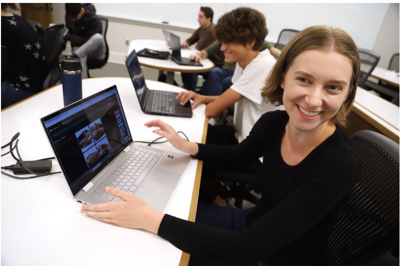 [Claire Beaumont laughs while using an online image generator to create a piece of transportation-themed furniture in a University of Portland class focused on exploring generative artificial intelligence tools]