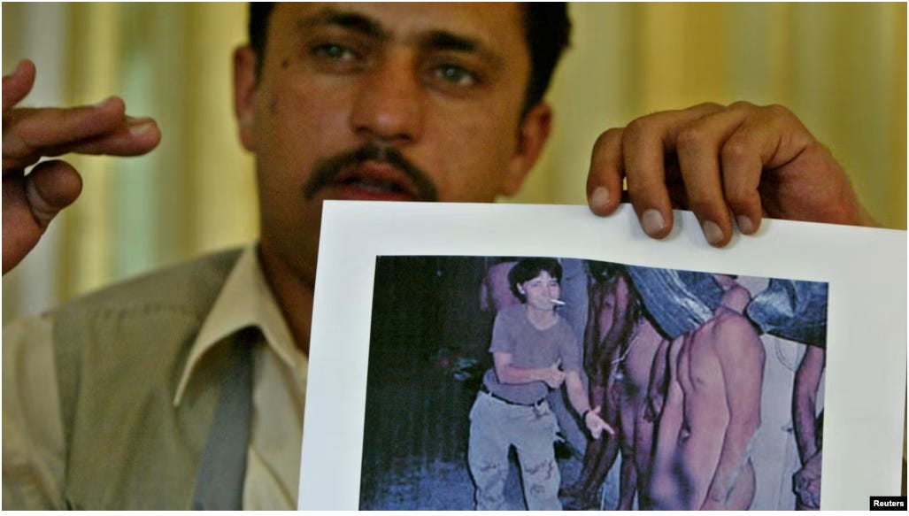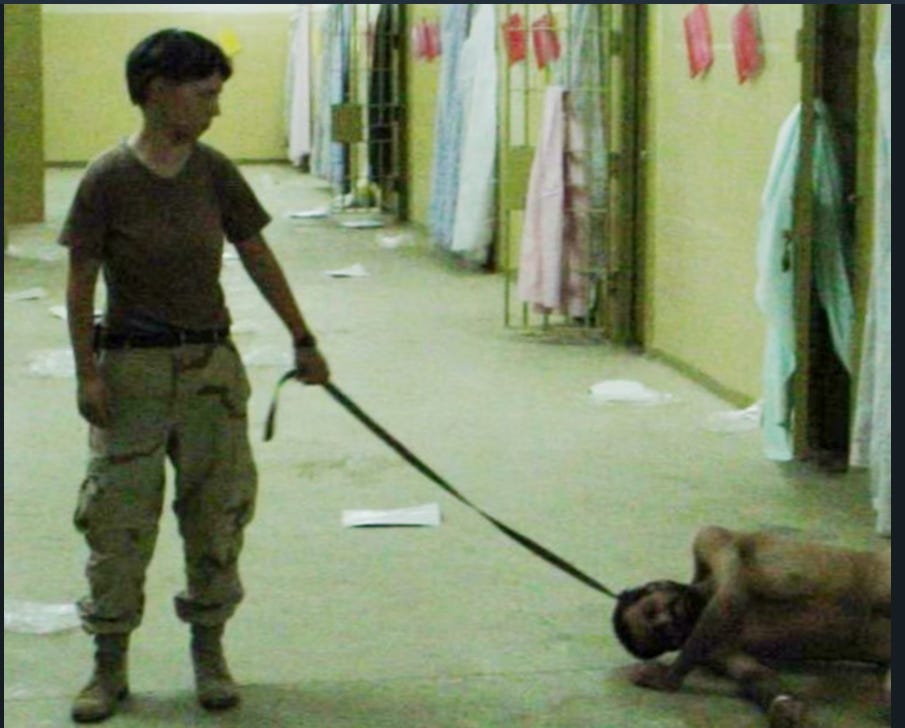 One photo shows an Iraqi teenager bound and standing in the headlights of a truck immediately after his mock execution, staged by U.S. soldiers. Another shows a group of soldiers forcing a detainee to look at pictures of lingerie-clad women. Another depicts the body of Muhamad Husain Kadir, an Iraqi farmer, shot dead at point-blank range by an American soldier while handcuffed.