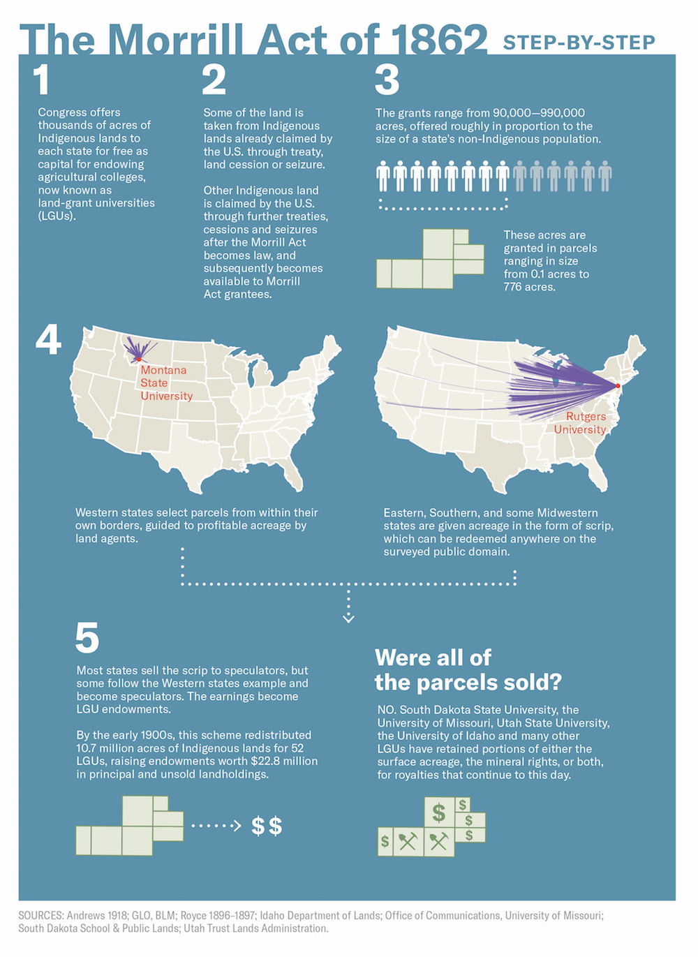 Ohio State was founded in 1870 as a land-grant university in accordance with the Morrill Act of 1862, by which the U.S. government gifted more than 11 million acres of expropriated Indigenous land to fledgling public universities as capital for the endowments. According to a 2020 investigation by High Country News, Ohio State received 614,325 acres of land—the third-most in the country, behind only Cornell University and Pennsylvania State University—seized or ceded by treaty from more than 100 Indigenous tribes.