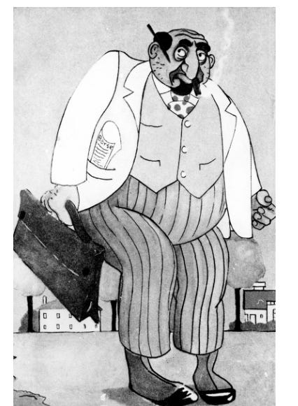 An antisemitic caricature of a capitalist Jew, smoking and unhealthy, disproportionately fat and unbalanced
