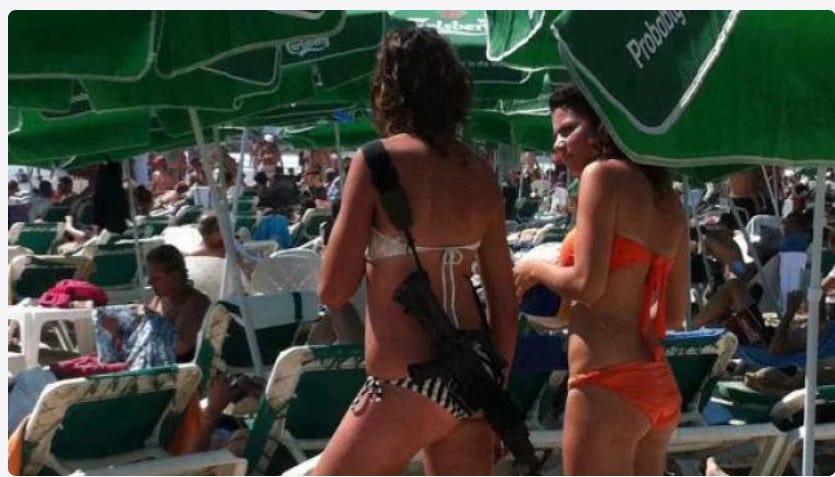 According to Allison Kaplan Sommer, who wrote a blog on Haaretz.com about the “hot Israel chick with gun,” it‘s not the bikini. Neither is it the gun. It‘s the combination of the two.