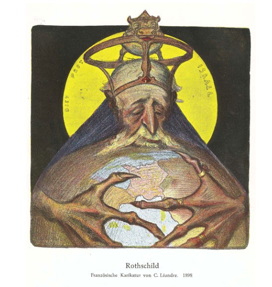 French antisemitic caricature portraying Jews taking over the world; Rothschild, the Jewish banking family, is portrayed as a demon hugging the world