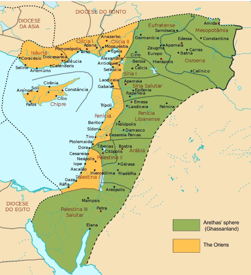 The Ghassanids bore the major brunt of the defense of the Christian Holy Land because they were stationed in the three provinces that surrounded it: the Provincia Arabia, Palaestina Secunda, and Palaestina Tertia.
