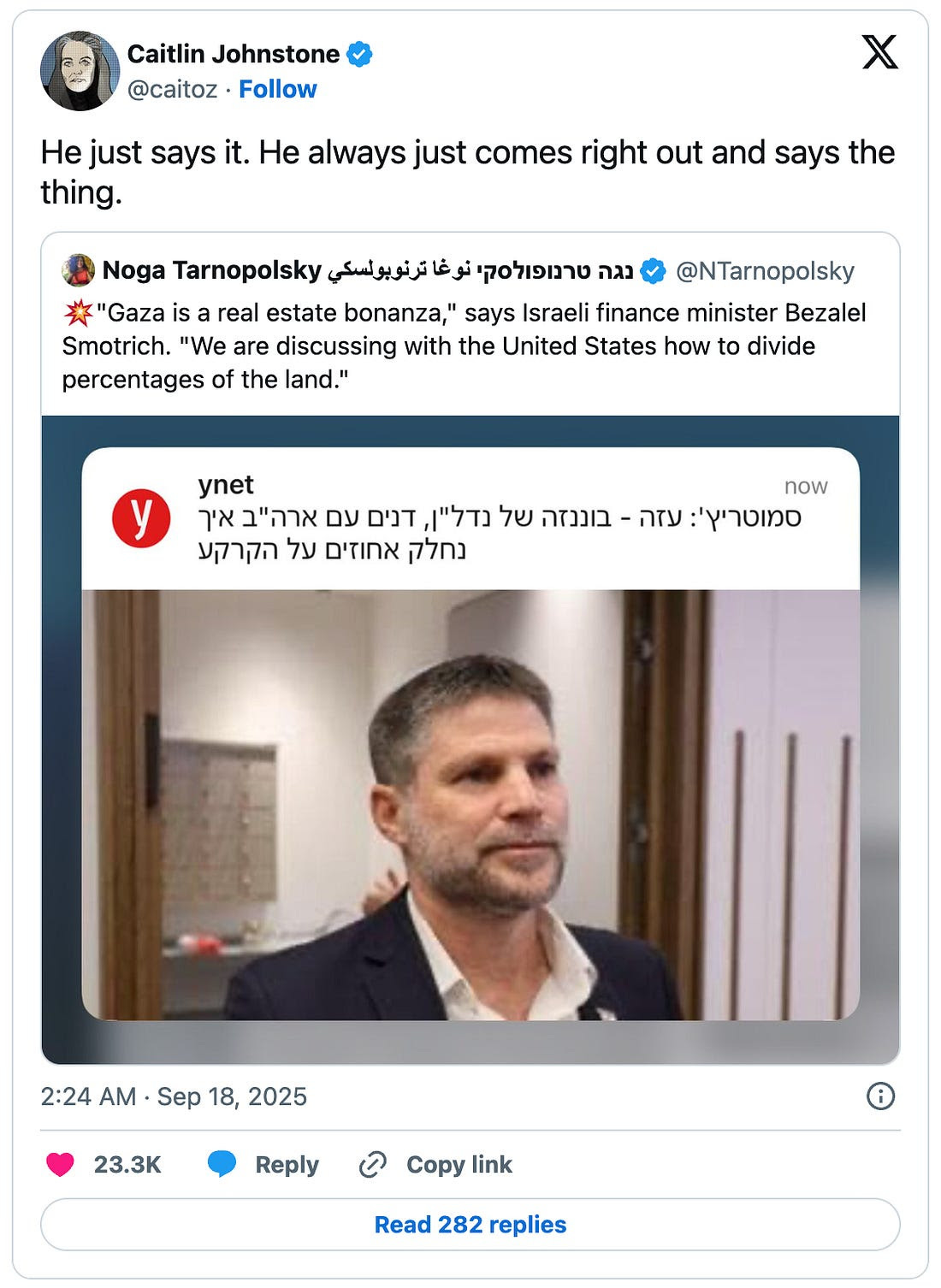 The rest of the statement is standard liberal Zionist fare, acknowledging the horror of the situation in Gaza while blaming it all on Benjamin Netanyahu and not the murderous apartheid state which would be doing what it’s doing with or without Netanyahu. It’s just progressive-sounding Israel apologia accompanied by a denunciation driven by the inability to escape finally calling this thing what it is.