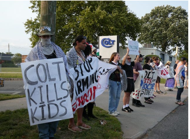 JEWS: Local activists protest outside of the Hartford, Connecticut plant of Colt, which manufactures rifles that are sold to Israel, on September 5, 2025. In July, Connecticut senator Richard Blumenthal voted against a Joint Resolution of Disapproval that would have blocked a sale of 20,000 M4 automatic rifles to the Israel National Police.