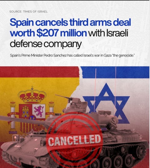 The cancellation comes after Madrid approved a total arms embargo on Israel as part of a package of measures aimed at halting what Prime Minister Pedro Sanchez called “the genocide in Gaza.”