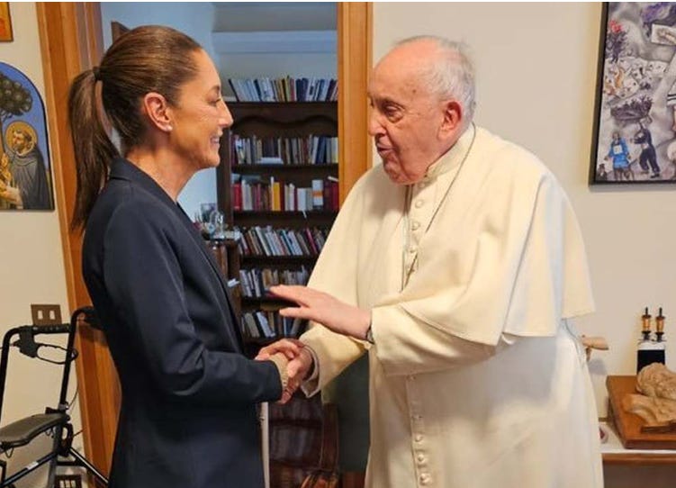 “Although Sheinbaum has repeatedly said that she does not practice any religion, she proudly publicized a meeting she held in February with Pope Francis and has indeed worn Catholic symbols at her rallies”