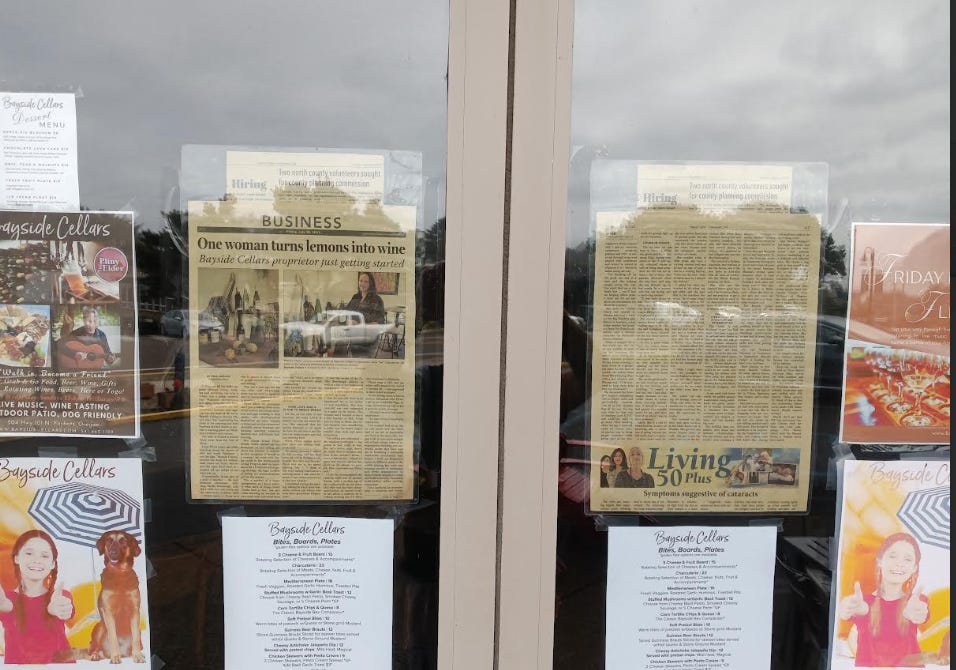 I remarked about the Bayside Cellars now in Yachats, moved from Waldport, and I did the story on the owner. She has my article on the front door.