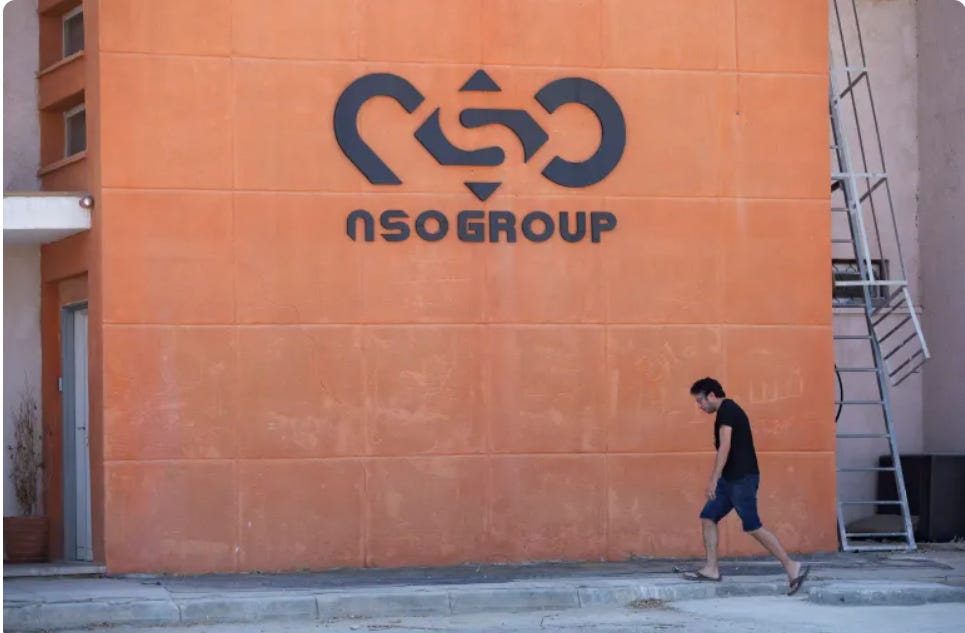 [Jew walking: A logo adorns a wall on a branch of the Israeli NSO Group, near the southern Israeli town of Sapir,]