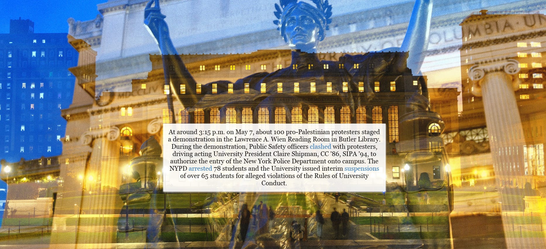 At around 3:15 p.m. on May 7, about 100 pro-Palestinian protesters staged a demonstration in the Lawrence A. Wien Reading Room in Butler Library. During the demonstration, Public Safety officers clashed with protesters, driving acting University President Claire Shipman, CC ’86, SIPA ’94, to authorize the entry of the New York Police Department onto campus. The NYPD arrested 78 students and the University issued interim suspensions of over 65 students for alleged violations of the Rules of University Conduct.