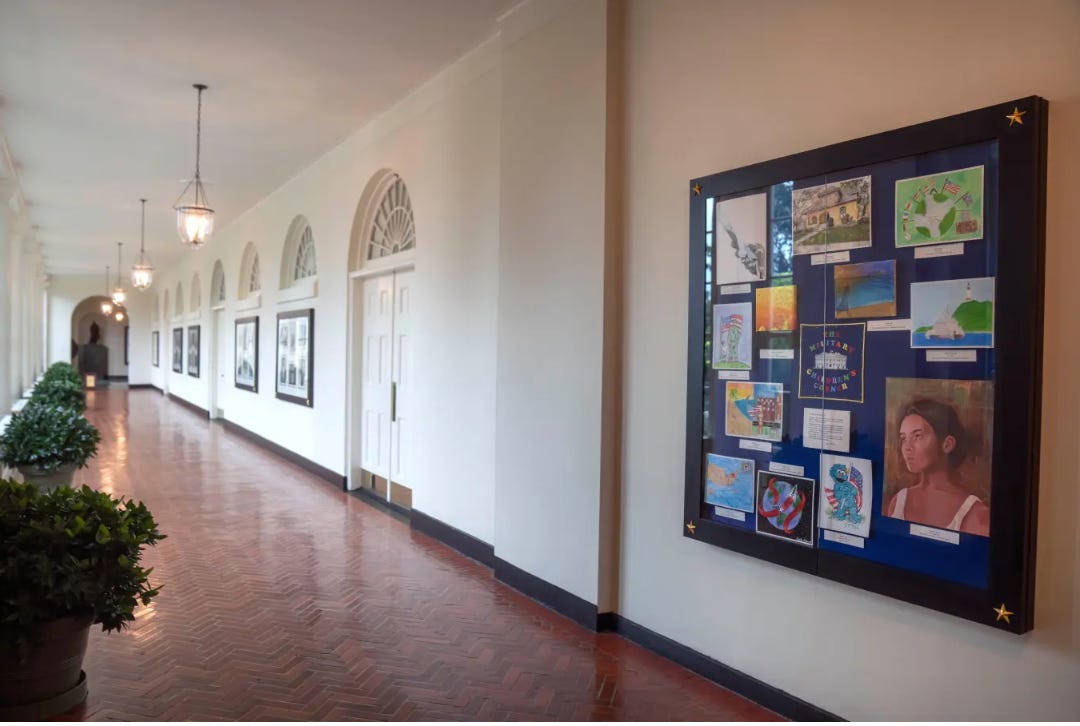 Artwork by military children decorates a display in the East Colonnade of the East Wing at the White House, Sept. 26, 2023,