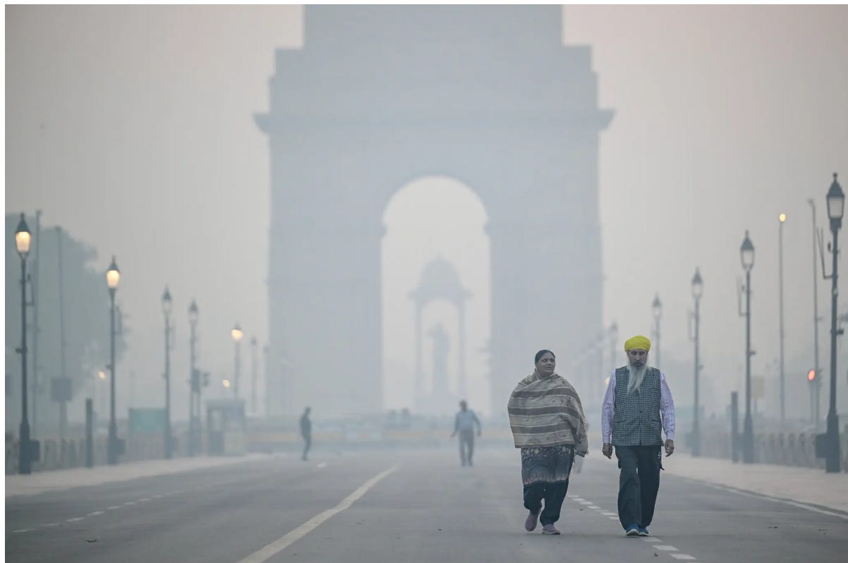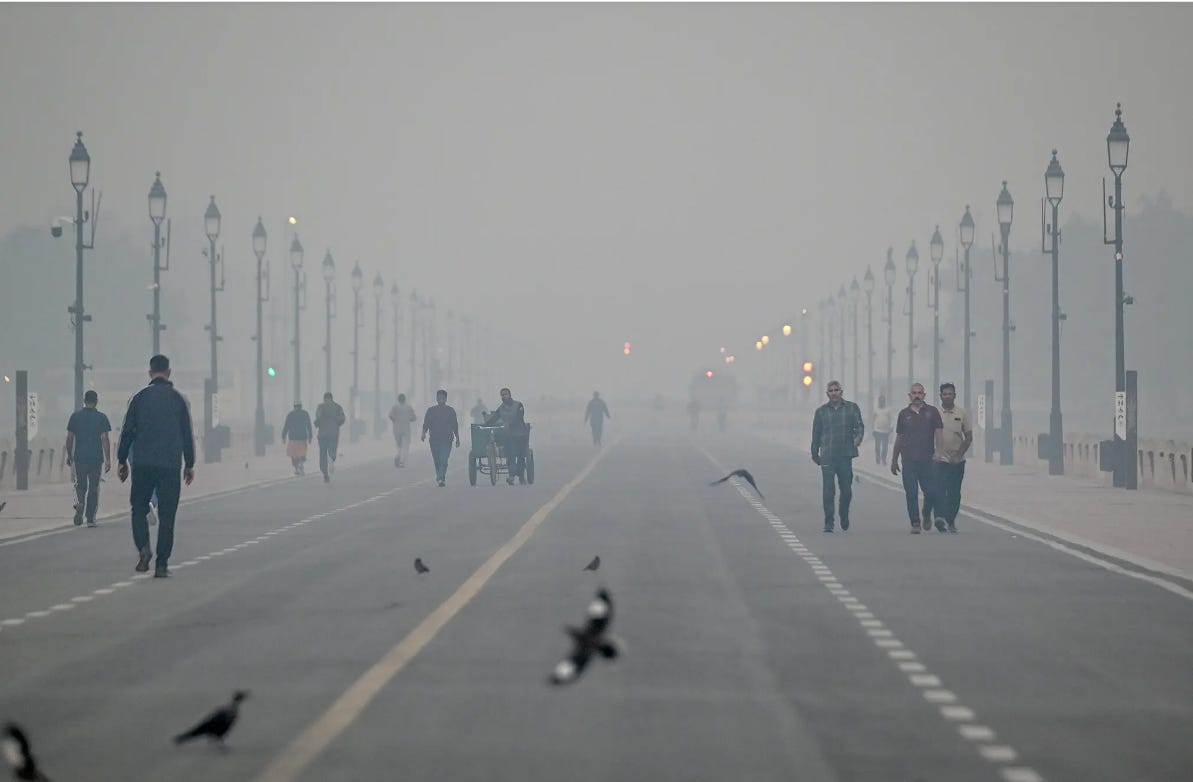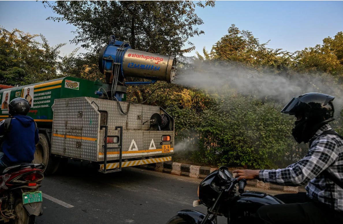 Progress!! A mobile water sprinkler sprays the streets of New Delhi in an effort to reduce air pollution.