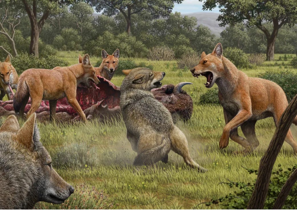 [All modern dogs are descended from a wolf species that when extinct around 15,000 years ago. Grey wolves, pictured here fighting for food with now extinct dire wolves (red), are dogs’ closest living relative.]