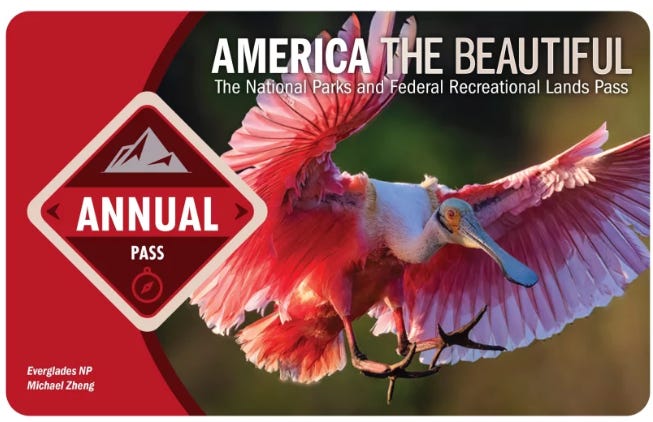 The America the Beautiful National Parks Annual Pass for 2025, showing one of the natural images which used to adorn the pass. Its picture, of a Roseate Spoonbill taken at Everglades National Park, was taken by Michael Zheng.