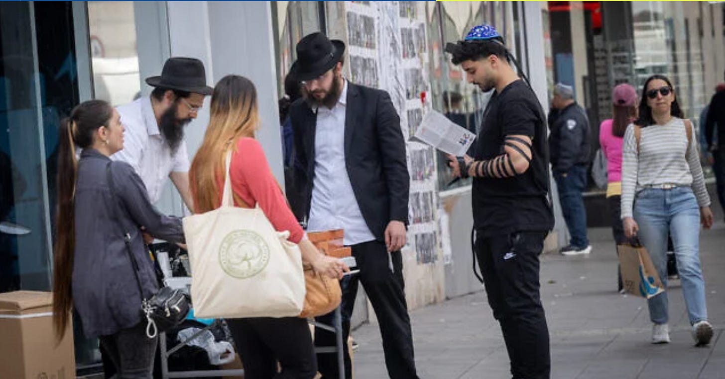 Then this Jewish Trash Truck shit from Times of Israel: From tefillin pop-ups to Shabbat candle lightings, many Israelis — including pop stars and former hostages — have increasingly turned to religion amid the war: ‘Faith provided an anchor’