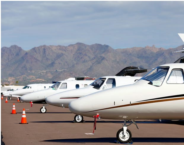 [Private jets at an airport in Arizona, US. Not only are the super-rich responsible for most carbon emissions, but they also invest in the most polluting industries.]