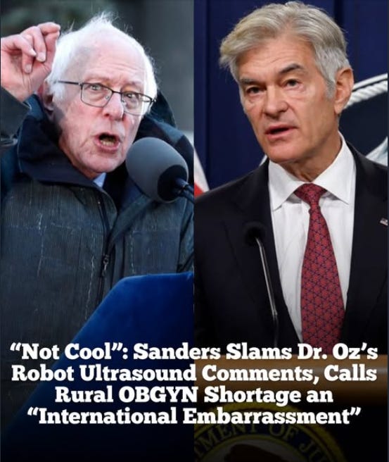 Sen. Bernie Sanders (I-Vt.) on Friday told Centers for Medicare and Medicaid Services (CMS) Administrator Mehmet Oz that it is not “cool” that robots are performing ultrasounds in Alabama, after Oz brought up the subject at the White House earlier in the day.