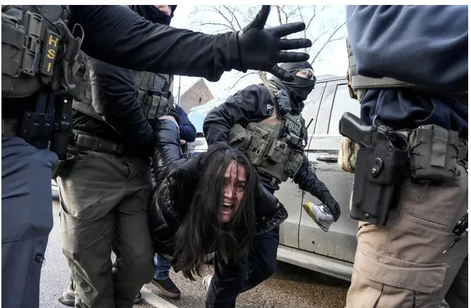 Federal agents carry away a woman in Minneapolis on Jan. 13, 2026, days after an Immigration and Customs Enforcement agent fatally shot Renee Nicole Good.