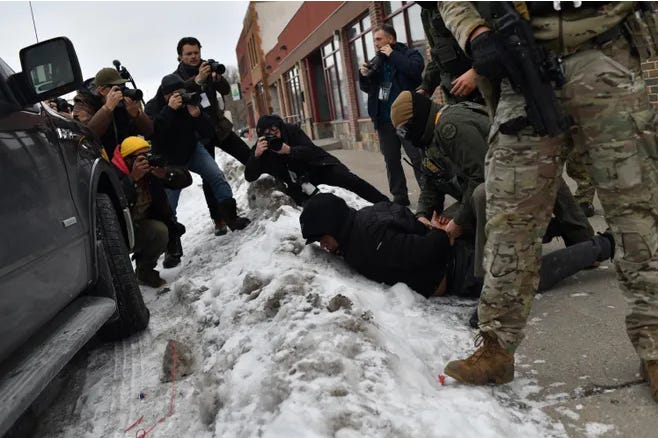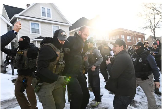 US Customs and Border Protection agents arrest a man after not providing documents proving he’s a citizen of the United States while patrolling a neighborhood during immigration enforcement activity in Minneapolis in Minneapolis, Minn. on Jan. 11, 2026. A US Immigration and Customs Enforcement (ICE) agent shot and killed 37-year-old Renee Nicole Good on the streets of Minneapolis on Jan. 7, leading to huge protests and outrage from local leaders who rejected White House claims she was a domestic terrorist.