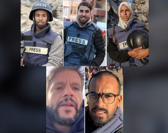 Palestinian journalists, top L-R, Mohammad Salama, Moaz Abu Taha and Mariam Dagga and bottom L-R, Hussam Al-Masri and Ahmed Abu Aziz who were killed in Gaza, Aug. 25, 2025.
