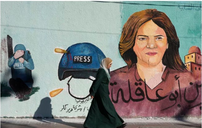 Abu Akleh, a veteran reporter for Al Jazeera, was wearing a blue flak jacket clearly marked “press” when she was shot and killed by an Israeli soldier while covering an Israeli military operation in the city of Jenin, in the West Bank. No one has been held accountable. At the time, Israel’s military said in a statement that it was a “high possibility that Ms. Abu Akleh was accidentally hit by IDF gunfire fired toward suspects identified as armed Palestinian gunmen during an exchange of fire in which life-threatening, widespread and indiscriminate shots were fired toward IDF soldiers.”