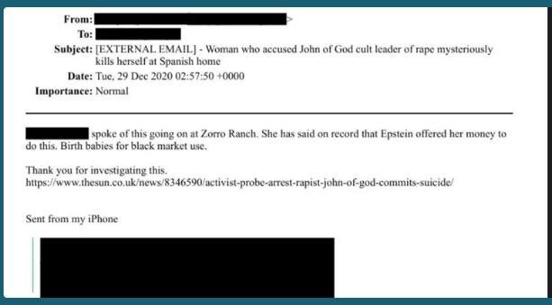 This revelation was brought to light in Epstein Files release EFTA00165118. In an email written between correspondents whose identities were redacted by the DOJ, the sender references an article published on the UK news outlet The Sun covering the suicide of Sabrina Bittencourt. Bittencourt, a victim of the Brazilian celebrity cult leader John of God (legal name João Teixeira de Faria), made famous by US talk show host Oprah Winfrey, alleged that the cult leader held young girls captive to breed them in order to sell their newborns on the black market before murdering the mothers. “Hundreds of girls were enslaved over years, lived on farms in Goias, and served as wombs to get pregnant for their babies to be sold,” Bittencourt alleged. These same allegations were made against Epstein by the sender in the email disclosed in the latest batch of the Epstein Files, who wrote, “[REDACTED] spoke of this going on at Zorro Ranch. She has said on record that Epstein offered her money to do this. Birth babies for black market use.”