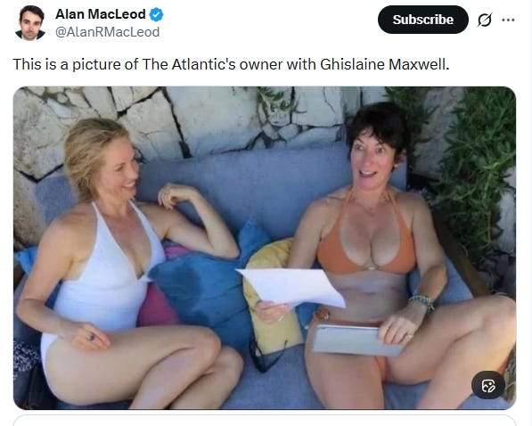 The Atlantic – which has spent two years justifying the genocide of Palestinians, claiming children are legitimate targets, demonizing anti-genocide protestors – is owned by Ghislaine ‘Rid the world of Arabs’ Maxwell’s associate Laurene Powell Jobs (Steve Job’s widow) and its EIC is former IDF prison guard Jeffrey Goldberg. Got it.