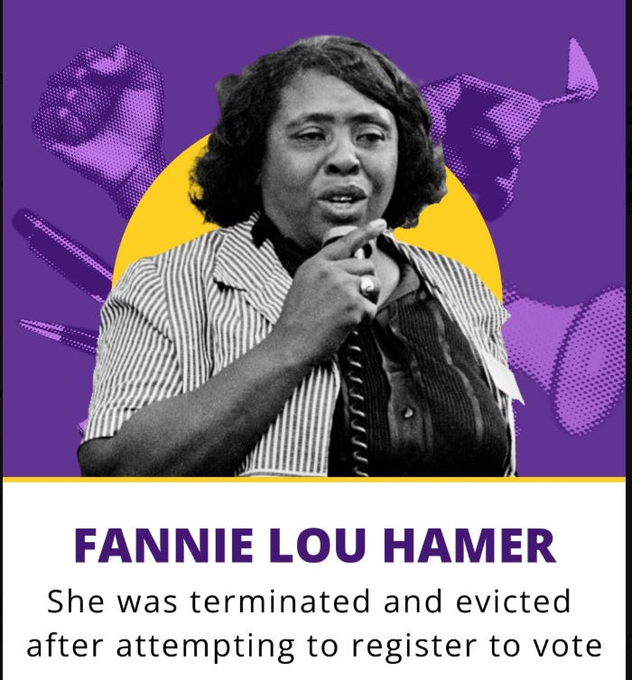 Fannie Lou Hamer was fired and evicted in 1962 after trying to register to vote in Mississippi, despite 18 years working on the plantation as a sharecropper and timekeeper. Yet, she refused to be silenced. Her courage helped launch the Mississippi Freedom Democratic Party and push forward the Voting Rights Act. Hamer’s sacrifice reminds us: the fight for equality has ALWAYS come at a cost. She risked everything so future generations could have a voice!