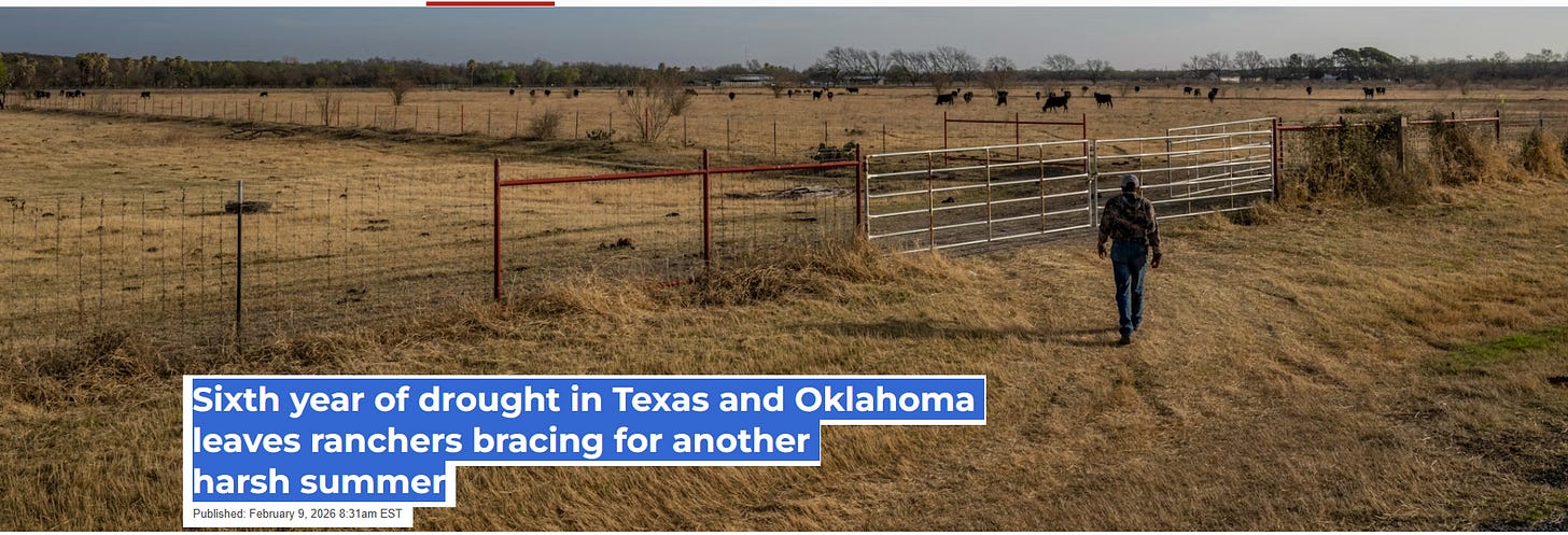 Many cattle producers and rangelands were still recovering from a severe 2010-2015 drought when a flash drought hit western Texas in spring 2020, marking the beginning of the current multibillion-dollar, multiyear and multistate drought. Ample spring rainfall in 2025 and severe flooding in central Texas that year weren’t enough to end the drought, and a powerful winter storm in late January 2026 missed the driest parts of the region.