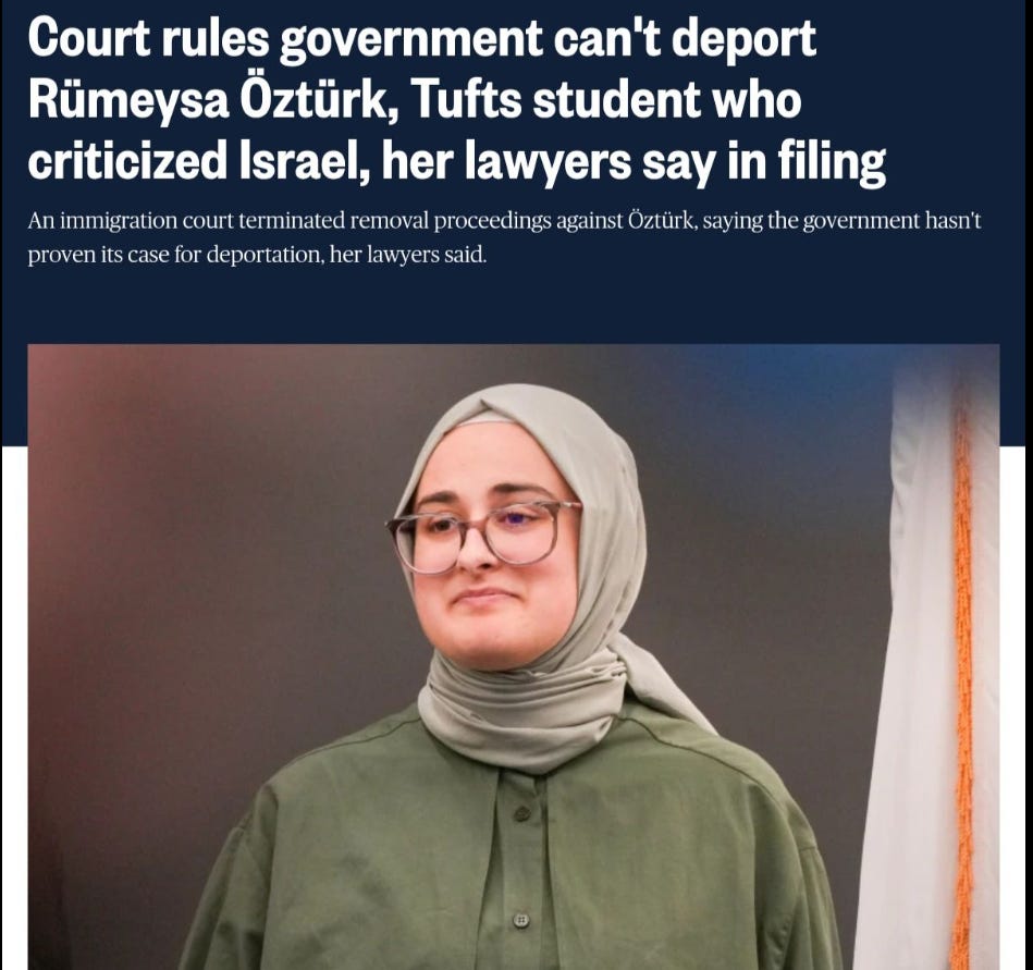 The move comes after recently unsealed court documents showed the federal government didn’t have any evidence that Öztürk had been supporting terrorist activity when she was arrested, and that her visa revocation and arrest were because of an opinion article she wrote containing criticisms of Israel.