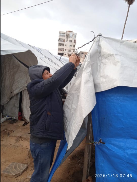 Seven of us are living in this tent. It is ripped open from the bombing. When the winter storms came, the water poured straight in. The ground turned to mud beneath us. Our blankets were soaked. The cold was so sharp it felt like it was cutting through our bones. We spent nights awake because the water kept rising around us. We tried to lift our belongings off the ground, but there is nowhere dry to put anything.