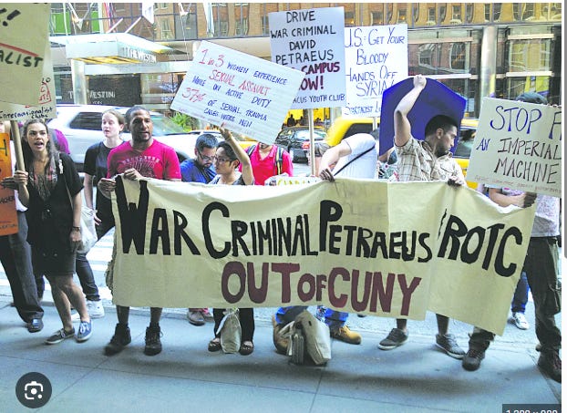 “CUNY Must Not Be a War College” and “Petraeus Out of CUNY” were among the signs protesters carried. Leaflets argued that Petraeus was guilty of war crimes in Iraq and Afghanistan, cited articles in The New York Times and the UK’s Guardian that described killing of civilians and torture by forces under Petraeus’s command, and said his appointment “should be rescinded.”