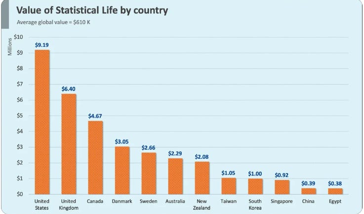 [An American life is worth $9.2 Million Dollars (Value of Statistical Life across countries)]