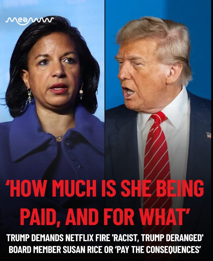 Now this Semen Drip Pedophile and Rapist in Chief is back with the fucking HollyDirt shit….. You know, USA USA USA is doing so well with health care, infrastructure, education, pollution, war war war: Trump demands Netflix fire former national security advisor Susan Rice from its board.